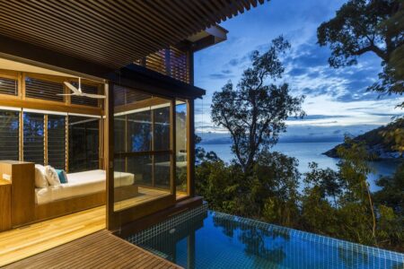 グレートバリアリーフの美しい海に面した熱帯雨林の森の中に10棟が点在する2階建て戸建ての別荘スタイル。